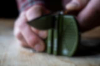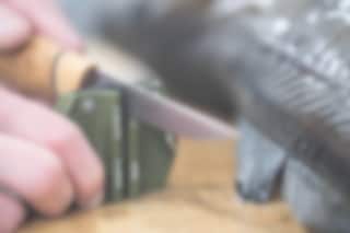Small light knife sharpener. Carbide material on one side and ceramic rods for fine grinding on the other side. Can be used on all types of knives, except knives with serrated knife blade.