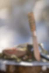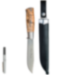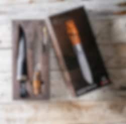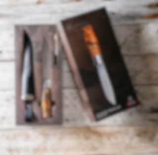 It comes in an elegant gift box, which also includes a small diamond sharpener with three practical functions: one for flat edges, one for serrated edges, and a groove specially designed for sharpening fish hooks. The back-ground blade allows you to use the spine with a firesteel, preserving the edge from wear.