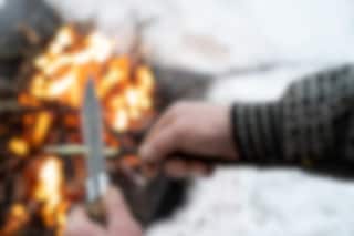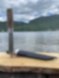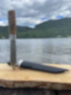 The blade is made from Sandvik stahl, known for its durability and ease of sharpening. The handle is crafted from specially treated curly birch, providing both a beautiful and functional grip. The knife is supplied with a stylish leather sheath for safe storage and easy access.