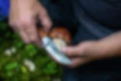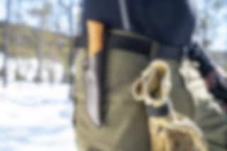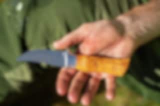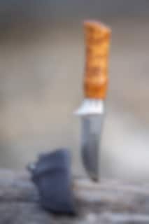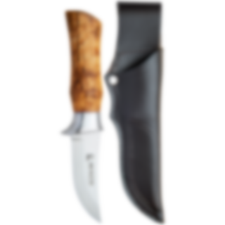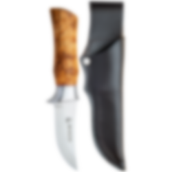 This is a very good hunting knife/hiking knife with a hollow-cut blade. The blade has a curved upswing (trailing point) adapted for hunting, but which is also applicable for other uses. Since the blade is hollow-cut, the knife is perfect for cutting meat (between the skin and the meat). The blade is not too long - which makes the knife good to use. The knife has a cast aluminum holk with finger guard. Sandvik steel in the blade which is extra durable and oiled curly birch in the shaft. The knife has a cast aluminum holk. The knife comes with a leather sheath and a beautiful gift box.