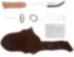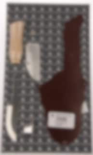 Piece of leather, needle, thread, safety insert, roughly shaped mountain birch blank, sleeve and Falken knife blade.