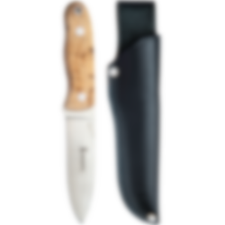 This is a powerful full-tong tour knife for hunters and outdoorsmen. The blade is a combination of traditional and modern knife technology. The tour knife is distinctive with its spear-shaped blade and serrating on the back of the blade. This is a knife for those who want a solid walking knife with a concave blade that can be used for most things. The knife is well balanced and is very well held when used. The shaft plates are narrowed down and are more profiled than previous blades. Bøhler 690 in the blade, which is durable and easy to grind back up. Oiled curly birch in the shaft. The knife is supplied with a black sheath and a beautiful gift box.