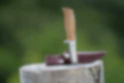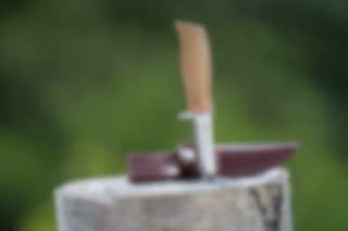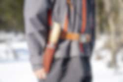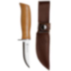 This is a traditional hiking knife (scout’s knife with pointed tip) with finger guard. The knife blade has a Scandinavian straight grinded edge. The shaft of the knife is designed to fit most hands and can be used for most of the tasks a knife receives. 14116N steel in the blade, which is durable and easy to grind back up. Oiled birch in the shaft. The knife comes with a brown sheath.