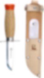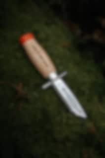 Brusletto Children's knife is our smallest knife yet. Made for the smallest children’s first knife. The shaft is made of varnished wood and the blade is made of stainless steel. The shaft is intended for small children's hands and the tip is blunt to prevent accidents. The knife has a finger guard (double pairing grip) in front of the blade. The knife has an orange tip to easily find it again if you lose it in the forest.