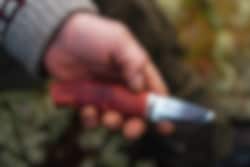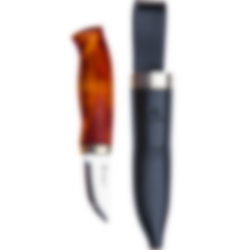 The knife is delivered with a sheath in coloured cowhide and safety inserts. Take good care of your knife and wipe it off after use before putting it back in the sheath. Then you have a great utility knife that will last a long time.