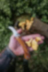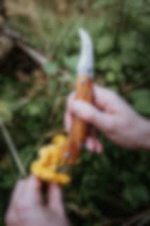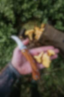 The Vedalen mushroom knife is a functional and well-designed tool for foraging, well suited for chanterelles and other edible mushrooms. The handle is made of durable, oiled olive wood, offering a secure grip even in damp conditions. At the opposite end of the blade, you'll find a dense and sturdy brush made from genuine wild boar bristles, which easily removes soil and debris from freshly picked mushrooms—without damaging the mushroom itself.