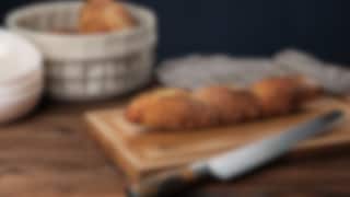 • Bread knife/pastry knife (26 cm), a modern, handy tool that effortlessly slices through crispy crusts, airy cake bases, and hearty bread.